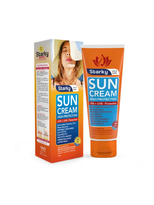 كريم الحمايه من الشمس ستاركي +50, يحمي البشره من الاشعه UVA + UVB , مضاد للاكسده لاحتوائه على فيتامين( C, E) , مقاوم للمياه .(WATER RESISTANCE )